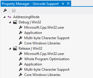 在菜单中选择View - Property Manager打开Property Manager,如下,这里可以指定不同版本(debug或release)的设置。