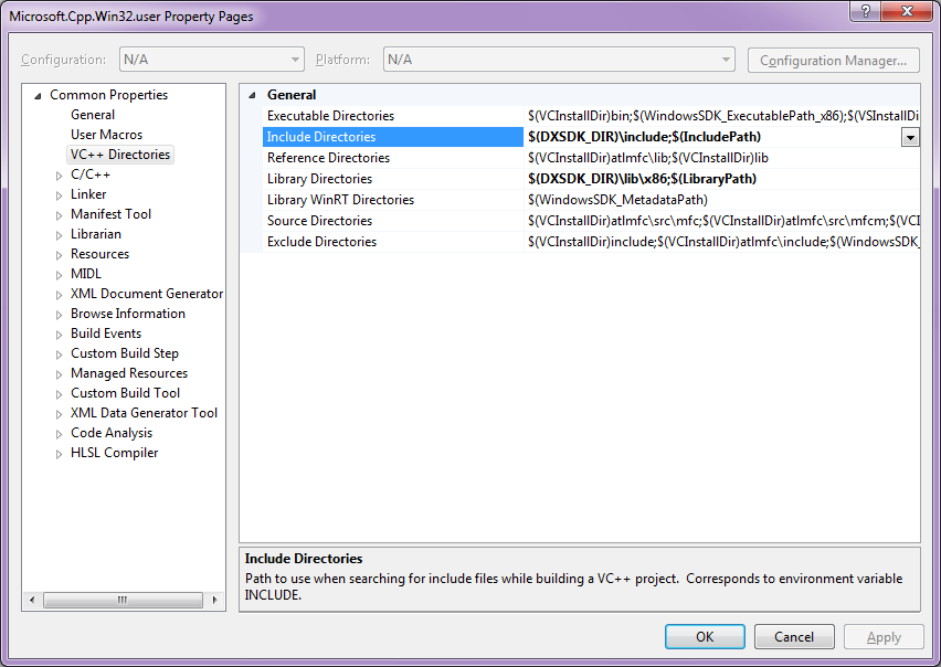 2. 选择Include files, 这个是DirectX头文件所在的地方,点击下面的新建文件夹按钮将DirectX头文件所在的路径输入进去。在我这里是
