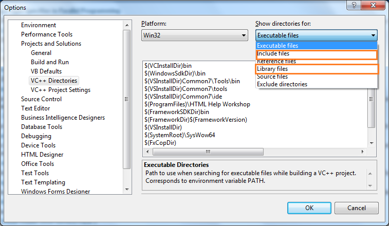 1. 启动VS,依次选择tools-option-projects and solutions-VC++Directories,在show directories for下面有几个选项