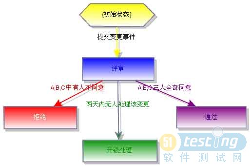 这工作流指明了,在一个变更事件被创建后,它需要经过一个《评审》状态。在评审阶段里,有三个人(A,B和C)要全部同意,才能到达《通过》状态。有任何一人不同意,状态就转到《拒绝》。当一到达《评审》状态,系统马上促发邮件和手机通知,将信息寄给A,B和C。系统可以预先设定这三人有两天的时间评审该变更。假如两天过了,状态仍为《评审》,那就是有人未及时处理该事件。这时候,系统会自动将事件升级,把状态转换为《升级处理》,系统马上促发邮件,将信息寄给研发部王总监。王总监可以斟酌情况,做最妥善的处理。