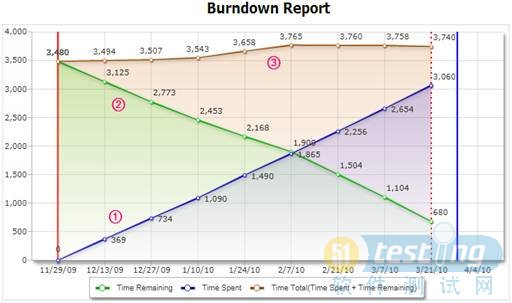 如图所示,起初这项目被估计是要3480小时完成。大致上来说,一般的研发团队因着人员请假、会议和其他突发事情,平均每人每天只能有六小时花在实际项目工作上。现这项目有七个人参与,估算出来大约需要四个月完成。(也就是从2009年11月29日到2010年3月29日,图中红色直立线为起始线,蓝色直立线为终止线。)这图里共有三条曲线。红色号码?/span>表示到现在为止在该项目的总花费时间,红色号码?表示估算的项目剩余时间,红色号码?是到目前为止所花的时间与剩余时间之和的曲线。到了2010年3月21日就得到了上面的这个图。到了这一天,我们发现原本估计的3480总小时数是低估了,更可能的是?所示的3740小时。