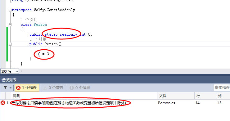 1 using System; 2 using System.Collections.Generic; 3 using System.Linq; 4 using System.Text; 5 using System.Threading.Tasks; 6 7 namespace Wolfy.ConstReadonly 8 { 9 class Person 10 { 11 public static readonly int C; 12 static Person() 13 { 14 C = 3; 15 } 16 } 17 }