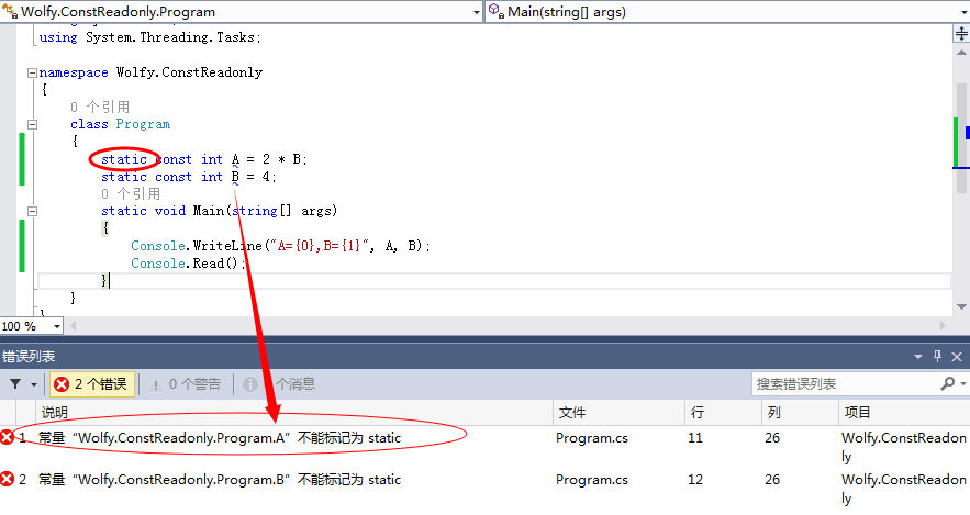 1 using System; 2 using System.Collections.Generic; 3 using System.Linq; 4 using System.Text; 5 using System.Threading.Tasks; 6 7 namespace Wolfy.ConstReadonly 8 { 9 class Program 10 { 11 static readonly int A = 2 * B; 12 static readonly int B = 4; 13 static void Main(string[] args) 14 { 15 Console.WriteLine("A={0},B={1}", A, B); 16 Console.Read(); 17 } 18 } 19 }