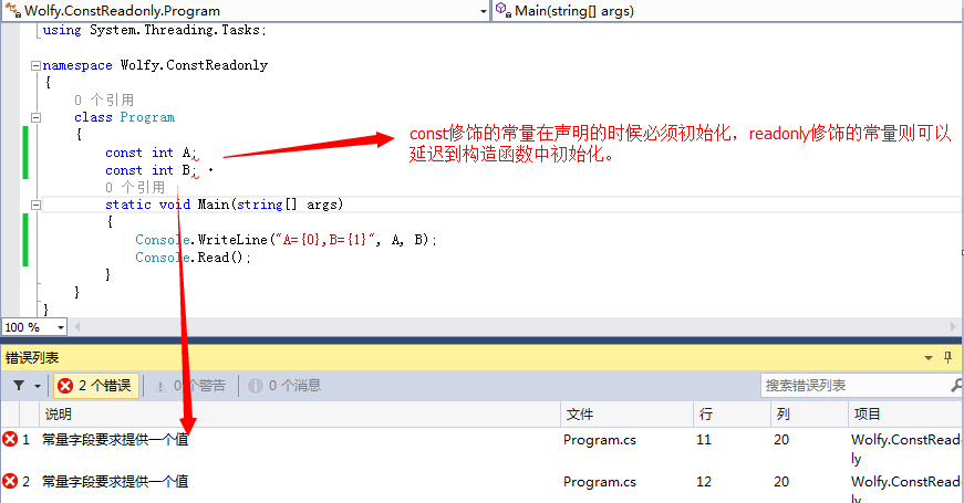 const修饰的常量在声明的时候必须初始化,readonly修饰的常量则可以延迟到构造函数中初始化。