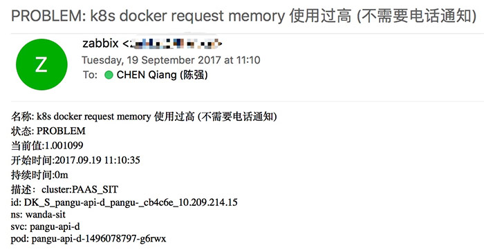 当监控到一定的数量级,超过某个阈值时,将产生告警。虽然 Grafana 目前支持邮件进行一些简单的告警,但我们还是通过制定一些监控点、告警机制、告警等级等,然后接入公司内部现有 Zabbix 平台来进行告警。