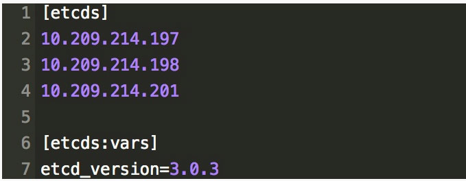为了展示一下组件容器化在部署方面带来的一些便利效果,以 Etcd 的部署为例,先在 Ansible inventory文件中规划好 Etcd 的分组信息,一般是采用 3 台做为集群即可。例如: