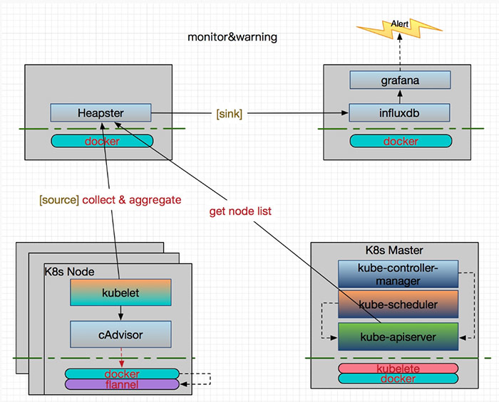 容器相关的监控,我们采用传统的 Heapster+InfluxDB+Grafana 方案: