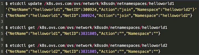 这是在我们通过 Kubernetes 创建 Namespace 时,K8S-OVS 自动检测并为我们创建的。其中 NetName 是指租户的 Kubernetes 命名空间;NetID 是指为该租户分配的VNI;Action 是指可以对该租户网络进行的操作,它包括 join :合并, isolate :分离, global :全网化,其中 join 需要指定上面的第四个参数 Namespace,用于表示需要和哪个租户进行合并,其他两个操作则不需要设置 Namespace。