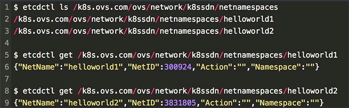 不同租户的网络隔离是通过为每个 Kubernetes 命名空间分配一个 VNI(VXLAN 中的概念)来实现的,在 VXLAN 中不同的 VNI 可以隔离不同的网络空间。K8S-OVS 将具体的 Kubernetes 命名空间和 VNI 的对应关系存储在 Etcd 中,如下: