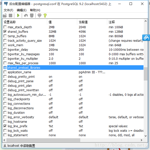 2.在弹出的配置窗口中,双击shared_preload_libraries选项