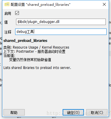 3.在弹出的配置设置shared_debugger.dll对话框中,旋转启用选项,设置值为"$libdir/plugin_debugger.dll"