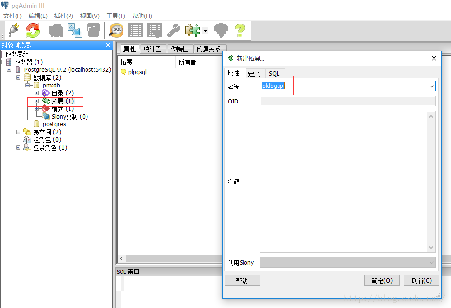 5.在需要调试的数据库中新建扩展,选择"pldbgapi"