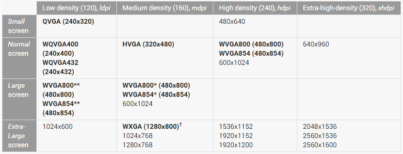 如图所示,像素密度在120左右的屏幕归为ldpi,160左右的归为mdpi,以此类推。这样,所有的Android屏幕都找到了自己的位置,并赋予了相应的倍率: