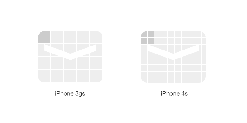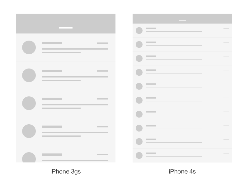 再用iPhone 3gs和4s来举例。假设有个邮件列表界面,我们不妨按照PC端网页设计的思维来想象。3gs上大概只能显示4-5行,4s就能显示9-10行,而且每行会变得特别宽。但两款手机其实是一样大的。如果照这种方式显示,3gs上刚刚好的效果,在4s上就会小到根本看不清字。