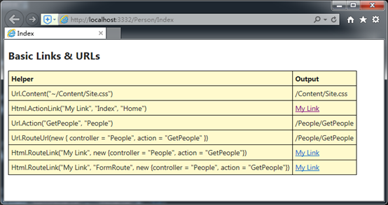 @{ ViewBag.Title = "Index"; } <h2>Basic Links Á URLs</h2> <table> <thead><tr><th>Helper</th><th>Output</th></tr></thead> <tbody> <tr> <td>Url.Content("~/Content/Site.css")</td> <td>@Url.Content("~/Content/Site.css")</td> </tr> <tr> <td>Html.ActionLink("My Link", "Index", "Home")</td> <td>@Html.ActionLink("My Link", "Index", "Home")</td> </tr> <tr> <td>Url.Action("GetPeople", "People")</td> <td>@Url.Action("GetPeople", "People")</td> </tr> <tr> <td>Url.RouteUrl(new { controller = "People", action = "GetPeople" })</td> <td>@Url.RouteUrl(new { controller = "People", action = "GetPeople" })</td> </tr> <tr> <td>Html.RouteLink("My Link", new {controller = "People", action = "GetPeople"})</td> <td>@Html.RouteLink("My Link", new { controller = "People", action = "GetPeople" })</td> </tr> <tr> <td>Html.RouteLink("My Link", "FormRoute", new {controller = "People", action = "GetPeople"})</td> <td>@Html.RouteLink("My Link", "FormRoute", new { controller = "People", action = "GetPeople" })</td> </tr> </tbody> </table>