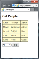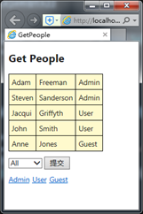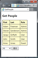 @using HelperMethods.Models @model string @{ ViewBag.Title = "GetPeople"; AjaxOptions ajaxOpts = new AjaxOptions { UpdateTargetId = "tableBody", Url = Url.Action("GetPeopleData") }; } <h2>Get People</h2> <table id="tableBody"> <thead><tr><th>First</th><th>Last</th><th>Role</th></tr></thead> <tbody> @Html.Action("GetPeopleData", new { selectedRole = Model }) </tbody> </table> @using (Ajax.BeginForm(ajaxOpts)) { <div> @Html.DropDownList("selectedRole", new SelectList(new[] { "All" }.Concat(Enum.GetNames(typeof(Role))))) <button type="submit">提交</button> </div> }