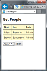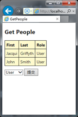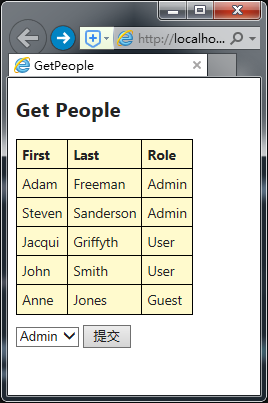 @using HelperMethods.Models @model IEnumerable<Person> @{ ViewBag.Title = "GetPeople"; } <h2>Get People</h2> <table> <thead><tr><th>First</th><th>Last</th><th>Role</th></tr></thead> <tbody> @foreach (Person p in Model) { <tr> <td>@p.FirstName</td> <td>@p.LastName</td> <td>@p.Role</td> </tr> } </tbody> </table> @using (Html.BeginForm()) { <div> @Html.DropDownList("selectedRole", new SelectList(new[] { "All" }.Concat(Enum.GetNames(typeof(Role))))) <button type="submit">提交</button> </div> }