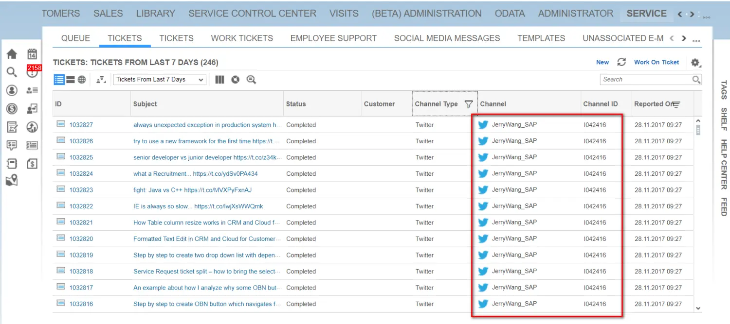 该后台作业会将该channel对应的Twitter应用指向的twitter账号发布的所有twitter抓到C4C来自动生成Tickets(服务请求):