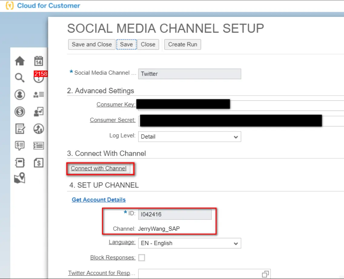 从下拉菜单里选择Channel(渠道)的类型为"Twitter",维护Twitter应用的consumer key和consumer Secret: