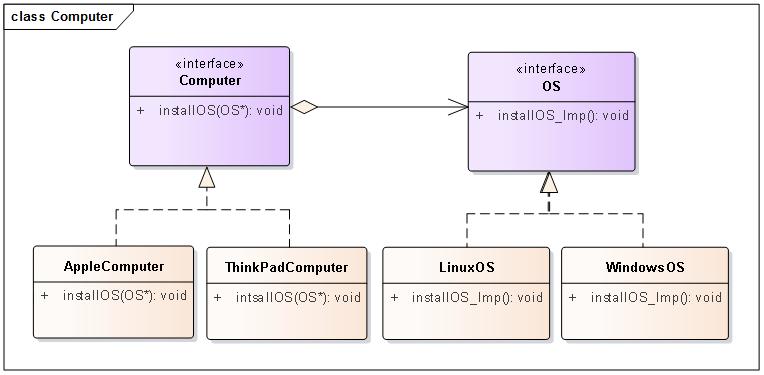 电脑品牌和操作系统是两个概念,不同的品牌的电脑可以安装相同或不同的操作系统,两者都具有很大的变动性。如果单独以电脑品牌或操作系统为基类来进行继承扩展的话,会使类的数目剧增并且耦合性很高,如果更改电脑品牌或增加操作系统类型都会增加很多的变动。