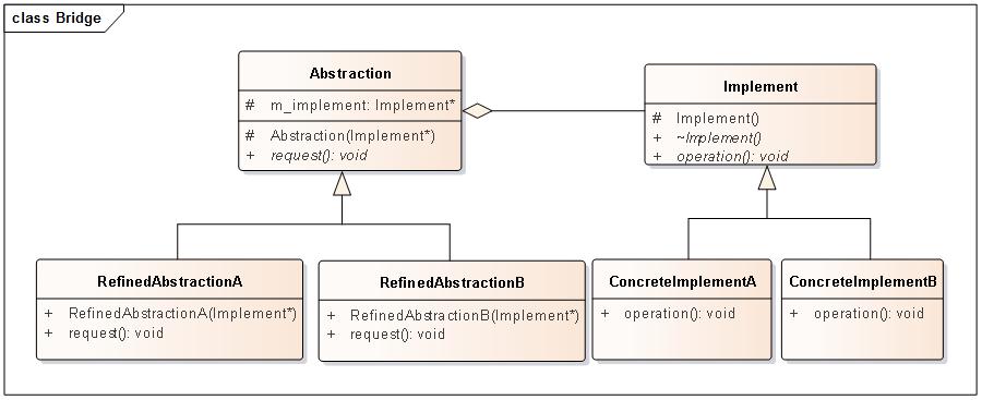 Implement::operation():实现抽象类Abstaction所定义操作的接口,由其具体派生类ConcreteImplemenA、ConcreteImplemenB或者其他派生类实现。