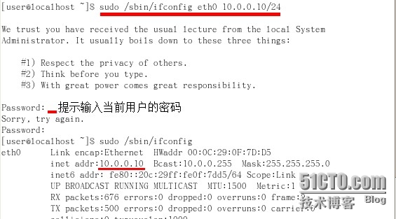 对于已获得授权的用户,通过sudo方式执行特权命令时,只需要将正常的命令行作为sudo命令的参数即可。如下:user用户执行ifconfig命令