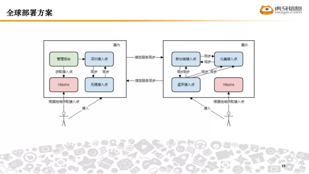 这是虎牙的一个全球化的部署方案,我们在全球部署了两个大区,分别是国内和国外。这两个大区是指定服务同步的,走的是专线,这样可以保障同步的稳定性。在一个大区内我们又部署了多个接入点,例如在国内大区,我们部署了深圳和无锡两个接入点,这两个节点的数据是互相同步、互为备份,保证在一个集群挂掉下可以切换到另外一个集群。