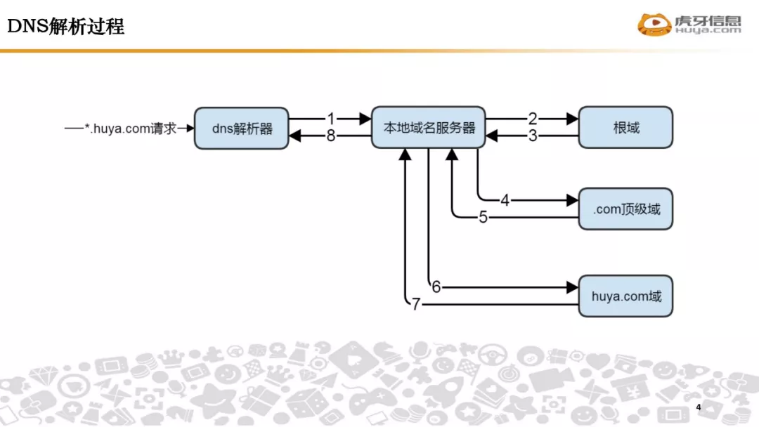 DNS 的解析过程很关键,例如上图中的 DNS 解析器通过一个定位解析追踪到我们的 DNS,再到本地域名服务器迭代解析,经过根域再到.com 名,最后到 huya.com 的根域名,获取最终的解析结果。