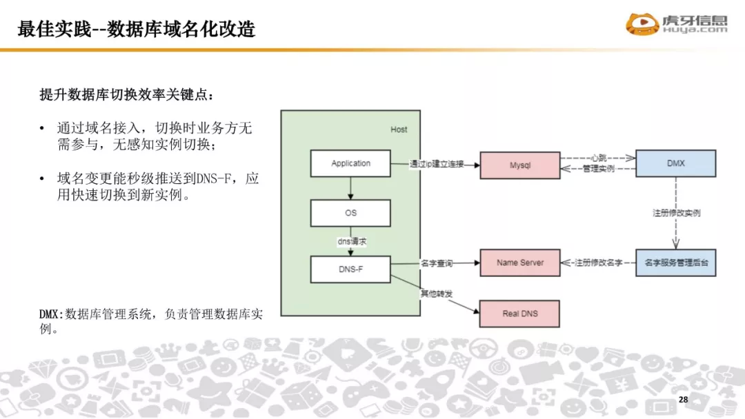 大家可以看一下??? 这个图,这是我们现在做的一个改造,图中的 DMX 是虎牙内部的一个数据库管理系统,思路就是把 DMX 和名字服务打通。DMX 会把数据库实例信息以服务的形式注册到名字服务,服务名就是域名。