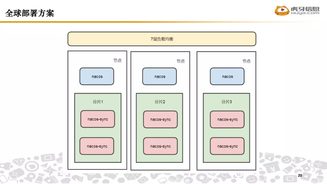 单个集群部署了多个 Nacos 节点,并通过 7 层负载均衡的方式暴露给外面使用,并且提供了多个 VIP,满足不同线路和区域的接入要求。同时,Nacos Sync 做了分片处理,将同步压力分散到各个分片上,一个分片下我们又部署了多个 Nacos Sync 的节点,以保障多活和高可用。