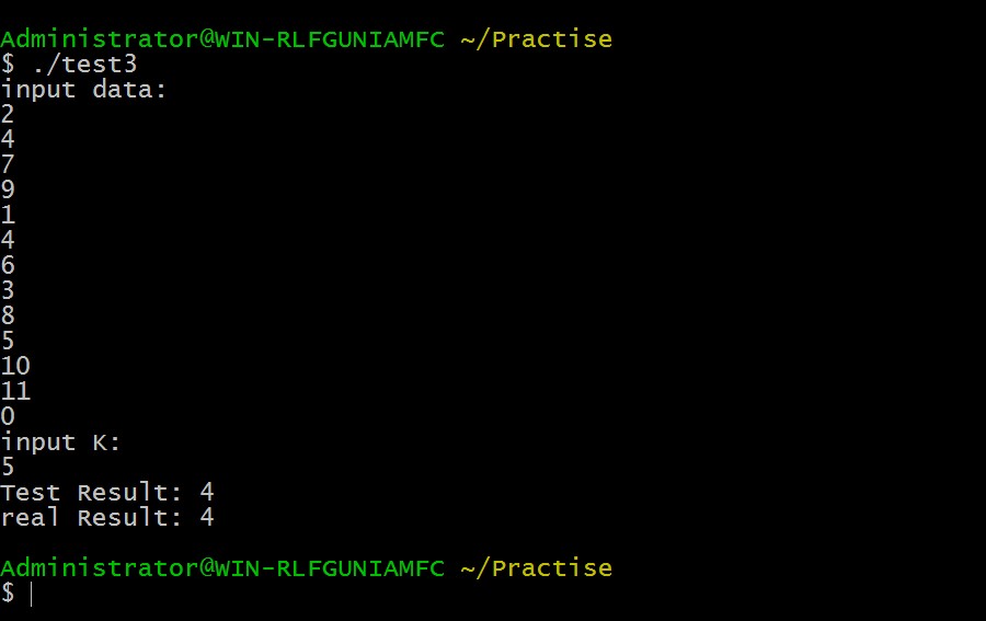 #include <iostream> #include <string> #include <cstring> #include <vector> #include <algorithm> using namespace std; void swap(int *p, int *q) { int t; t = *p; *p = *q; *q = t; } int findNumberK(vector<int> &vec, int k, int s, int e) { int roll = vec[s], be = 0, j = s; for(int i = s+1 ; i<= e ; i++) { if(vec[i] < roll) { j++; swap(&vec[i], &vec[j]); be++; } } swap(&vec[s], &vec[j]); if(be == k -1 ) return roll; else if (be < k - 1) { return findNumberK(vec, k - be - 1, j + 1, e); } else return findNumberK(vec, k, s, j - 1); } int main() { vector<int> a; int temp, k; cout << "input data:" << endl; cin >> temp; while(temp != 0) { a.push_back(temp); cin >> temp; } cout << "input K: " << endl; cin >> k; int re = findNumberK(a , k, 0 ,a.size() - 1); cout << "Test Result: " << re << endl; sort(a.begin(), a.end(), less<int>()); cout << "real Result: " << a[k-1] << endl; return 0; }