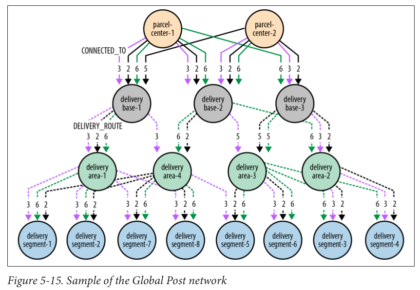CREATE // Parcel Center (pc1:Center {name : 'Parcel Center-1'}), (pc2:Center {name : 'Parcel Center-2'}), // Delivery Base (db1:Base {name : 'Delivery Base1'}), (db2:Base {name : 'Delivery Base2'}), (db3:Base {name : 'Delivery Base3'}), // Delivery Area (da1:Area {name : 'Delivery Area1'}), (da2:Area {name : 'Delivery Area2'}), (da3:Area {name : 'Delivery Area3'}), (da4:Area {name : 'Delivery Area4'}), // Delivery Segment (ds1:Segment {name : 'Delivery Segment1'}), (ds2:Segment {name : 'Delivery Segment2'}), (ds3:Segment {name : 'Delivery Segment3'}), (ds4:Segment {name : 'Delivery Segment4'}), (ds5:Segment {name : 'Delivery Segment5'}), (ds6:Segment {name : 'Delivery Segment6'}), (ds7:Segment {name : 'Delivery Segment7'}), (ds8:Segment {name : 'Delivery Segment8'}), // CONNECTED_TO (pc1)-[:CONNECTED_TO {cost:3, start_date:1350255600000, end_date:1350860400000}]->(db1), (pc1)-[:CONNECTED_TO {cost:2, start_date:1350860400000, end_date:1351465200000}]->(db1), (pc1)-[:CONNECTED_TO {cost:6, start_date:1351465200000, end_date:1352070000000}]->(db1), (pc1)-[:CONNECTED_TO {cost:3, start_date:1350255600000, end_date:1350860400000}]->(db2), (pc1)-[:CONNECTED_TO {cost:2, start_date:1350860400000, end_date:1351465200000}]->(db2), (pc1)-[:CONNECTED_TO {cost:6, start_date:1351465200000, end_date:1352070000000}]->(db2), (pc1)-[:CONNECTED_TO {cost:6, start_date:1351465200000, end_date:1352070000000}]->(db3), (pc2)-[:CONNECTED_TO {cost:5, start_date:1350860400000, end_date:1351465200000}]->(db1), (pc2)-[:CONNECTED_TO {cost:3, start_date:1350255600000, end_date:1350860400000}]->(db2), (pc2)-[:CONNECTED_TO {cost:2, start_date:1350860400000, end_date:1351465200000}]->(db2), (pc2)-[:CONNECTED_TO {cost:6, start_date:1351465200000, end_date:1352070000000}]->(db2), (pc2)-[:CONNECTED_TO {cost:3, start_date:1350255600000, end_date:1350860400000}]->(db3), (pc2)-[:CONNECTED_TO {cost:2, start_date:1350860400000, end_date:1351465200000}]->(db3), // DELIVERY_ROUTE (db1)-[:DELIVERY_ROUTE {cost:3, start_date:1350255600000, end_date:1350860400000}]->(da1), (db1)-[:DELIVERY_ROUTE {cost:2, start_date:1350860400000, end_date:1351465200000}]->(da1), (db1)-[:DELIVERY_ROUTE {cost:6, start_date:1351465200000, end_date:1352070000000}]->(da1), (db1)-[:DELIVERY_ROUTE {cost:3, start_date:1350255600000, end_date:1350860400000}]->(da4), (db2)-[:DELIVERY_ROUTE {cost:2, start_date:1350860400000, end_date:1351465200000}]->(da4), (db2)-[:DELIVERY_ROUTE {cost:6, start_date:1351465200000, end_date:1352070000000}]->(da4), (db2)-[:DELIVERY_ROUTE {cost:5, start_date:1350255600000, end_date:1350860400000}]->(da3), (db2)-[:DELIVERY_ROUTE {cost:6, start_date:1351465200000, end_date:1352070000000}]->(da2), (db3)-[:DELIVERY_ROUTE {cost:5, start_date:1350860400000, end_date:1351465200000}]->(da3), (db3)-[:DELIVERY_ROUTE {cost:5, start_date:1351465200000, end_date:1352070000000}]->(da3), (db3)-[:DELIVERY_ROUTE {cost:3, start_date:1350255600000, end_date:1350860400000}]->(da2), (db3)-[:DELIVERY_ROUTE {cost:2, start_date:1350860400000, end_date:1351465200000}]->(da2), (da1)-[:DELIVERY_ROUTE {cost:3, start_date:1350255600000, end_date:1350860400000}]->(ds1), (da1)-[:DELIVERY_ROUTE {cost:6, start_date:1351465200000, end_date:1352070000000}]->(ds1), (da1)-[:DELIVERY_ROUTE {cost:3, start_date:1350255600000, end_date:1350860400000}]->(ds2), (da1)-[:DELIVERY_ROUTE {cost:6, start_date:1351465200000, end_date:1352070000000}]->(ds2), (da1)-[:DELIVERY_ROUTE {cost:3, start_date:1350255600000, end_date:1350860400000}]->(ds7), (da1)-[:DELIVERY_ROUTE {cost:3, start_date:1350255600000, end_date:1350860400000}]->(ds8), (da4)-[:DELIVERY_ROUTE {cost:2, start_date:1350860400000, end_date:1351465200000}]->(ds1), (da4)-[:DELIVERY_ROUTE {cost:2, start_date:1350860400000, end_date:1351465200000}]->(ds2), (da4)-[:DELIVERY_ROUTE {cost:2, start_date:1350860400000, end_date:1351465200000}]->(ds7), (da4)-[:DELIVERY_ROUTE {cost:6, start_date:1351465200000, end_date:1352070000000}]->(ds7), (da4)-[:DELIVERY_ROUTE {cost:2, start_date:1350860400000, end_date:1351465200000}]->(ds8), (da4)-[:DELIVERY_ROUTE {cost:6, start_date:1351465200000, end_date:1352070000000}]->(ds8), (da4)-[:DELIVERY_ROUTE {cost:3, start_date:1350255600000, end_date:1350860400000}]->(ds5), (da3)-[:DELIVERY_ROUTE {cost:2, start_date:1350860400000, end_date:1351465200000}]->(ds5), (da3)-[:DELIVERY_ROUTE {cost:6, start_date:1351465200000, end_date:1352070000000}]->(ds5), (da3)-[:DELIVERY_ROUTE {cost:3, start_date:1350255600000, end_date:1350860400000}]->(ds6), (da3)-[:DELIVERY_ROUTE {cost:2, start_date:1350860400000, end_date:1351465200000}]->(ds6), (da3)-[:DELIVERY_ROUTE {cost:6, start_date:1351465200000, end_date:1352070000000}]->(ds6), (da3)-[:DELIVERY_ROUTE {cost:6, start_date:1351465200000, end_date:1352070000000}]->(ds3), (da3)-[:DELIVERY_ROUTE {cost:6, start_date:1351465200000, end_date:1352070000000}]->(ds4), (da2)-[:DELIVERY_ROUTE {cost:3, start_date:1350255600000, end_date:1350860400000}]->(ds3), (da2)-[:DELIVERY_ROUTE {cost:2, start_date:1350860400000, end_date:1351465200000}]->(ds3), (da2)-[:DELIVERY_ROUTE {cost:3, start_date:1350255600000, end_date:1350860400000}]->(ds4), (da2)-[:DELIVERY_ROUTE {cost:2, start_date:1350860400000, end_date:1351465200000}]->(ds4) ;