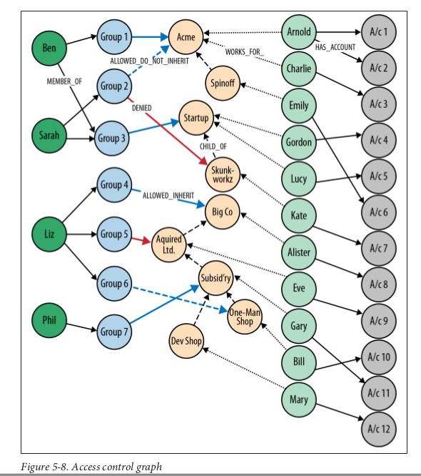 CREATE // Admin (ab:Admin {name : 'Ben'}), (as1:Admin {name : 'Sarah'}), (al:Admin {name : 'Liz'}), (ap:Admin {name : 'Phil'}), // Group (g1:Group {name : 'Group1'}), (g2:Group {name : 'Group2'}), (g3:Group {name : 'Group3'}), (g4:Group {name : 'Group4'}), (g5:Group {name : 'Group5'}), (g6:Group {name : 'Group6'}), (g7:Group {name : 'Group7'}), // Company (ca:Company {name : 'Acme'}), (cs:Company {name : 'Spinoff'}), (cs1:Company {name : 'Startup'}), (cs2:Company {name : 'Skunk-workz'}), (cb:Company {name : 'Big Co'}), (ca1:Company {name : 'Aquired Ltd.'}), (cs3:Company {name : 'Subsid\'ry'}), (co:Company {name : 'One-Man Shop'}), (cd:Company {name : 'Dev Shop'}), // Employee (ea:Employee {name : 'Arnold'}), (ec:Employee {name : 'Charlie'}), (ee:Employee {name : 'Emily'}), (eg:Employee {name : 'Gordon'}), (el:Employee {name : 'Lucy'}), (ek:Employee {name : 'Kate'}), (ea1:Employee {name : 'Alister'}), (ee1:Employee {name : 'Eve'}), (eg1:Employee {name : 'Gary'}), (eb:Employee {name : 'Bill'}), (em:Employee {name : 'Mary'}), // Account (n1:Account {name : 'Account1'}), (n2:Account {name : 'Account2'}), (n3:Account {name : 'Account3'}), (n4:Account {name : 'Account4'}), (n5:Account {name : 'Account5'}), (n6:Account {name : 'Account6'}), (n7:Account {name : 'Account7'}), (n8:Account {name : 'Account8'}), (n9:Account {name : 'Account9'}), (n10:Account {name : 'Account10'}), (n11:Account {name : 'Account11'}), (n12:Account {name : 'Account12'}), // MEMBER_OF (ab)-[:MEMBER_OF]->(g1), (ab)-[:MEMBER_OF]->(g3), (as1)-[:MEMBER_OF]->(g2), (as1)-[:MEMBER_OF]->(g3), (al)-[:MEMBER_OF]->(g4), (al)-[:MEMBER_OF]->(g5), (al)-[:MEMBER_OF]->(g6), (ap)-[:MEMBER_OF]->(g7), // ALLOWED_INHERIT (g1)-[:ALLOWED_INHERIT]->(ca), (g3)-[:ALLOWED_INHERIT]->(cs1), (g4)-[:ALLOWED_INHERIT]->(cb), (g7)-[:ALLOWED_INHERIT]->(cs3), // ALLOWED_DO_NOT_INHERIT (g2)-[:ALLOWED_DO_NOT_INHERIT]->(ca), (g6)-[:ALLOWED_DO_NOT_INHERIT]->(co), // DENIED (g2)-[:DENIED]->(cs2), (g5)-[:DENIED]->(ca1), // CHILD_OF (cs)-[:CHILD_OF]->(ca), (cs2)-[:CHILD_OF]->(cs1), (ca1)-[:CHILD_OF]->(cb), (cs3)-[:CHILD_OF]->(ca1), (co)-[:CHILD_OF]->(cs3), (cd)-[:CHILD_OF]->(cs3), // WORKS_FOR (ea)-[:WORKS_FOR]->(ca), (ec)-[:WORKS_FOR]->(ca), (ee)-[:WORKS_FOR]->(cs), (eg)-[:WORKS_FOR]->(cs1), (el)-[:WORKS_FOR]->(cs1), (ek)-[:WORKS_FOR]->(cs2), (ea1)-[:WORKS_FOR]->(cb), (ee1)-[:WORKS_FOR]->(ca1), (eg1)-[:WORKS_FOR]->(cs3), (eb)-[:WORKS_FOR]->(co), (em)-[:WORKS_FOR]->(cd), // HAS_ACCOUNT (ea)-[:HAS_ACCOUNT]->(n1), (ea)-[:HAS_ACCOUNT]->(n2), (ec)-[:HAS_ACCOUNT]->(n3), (eg)-[:HAS_ACCOUNT]->(n4), (el)-[:HAS_ACCOUNT]->(n5), (ee)-[:HAS_ACCOUNT]->(n6), (ek)-[:HAS_ACCOUNT]->(n7), (ea1)-[:HAS_ACCOUNT]->(n8), (ee1)-[:HAS_ACCOUNT]->(n9), (eb)-[:HAS_ACCOUNT]->(n10), (eg1)-[:HAS_ACCOUNT]->(n11), (em)-[:HAS_ACCOUNT]->(n12) ;