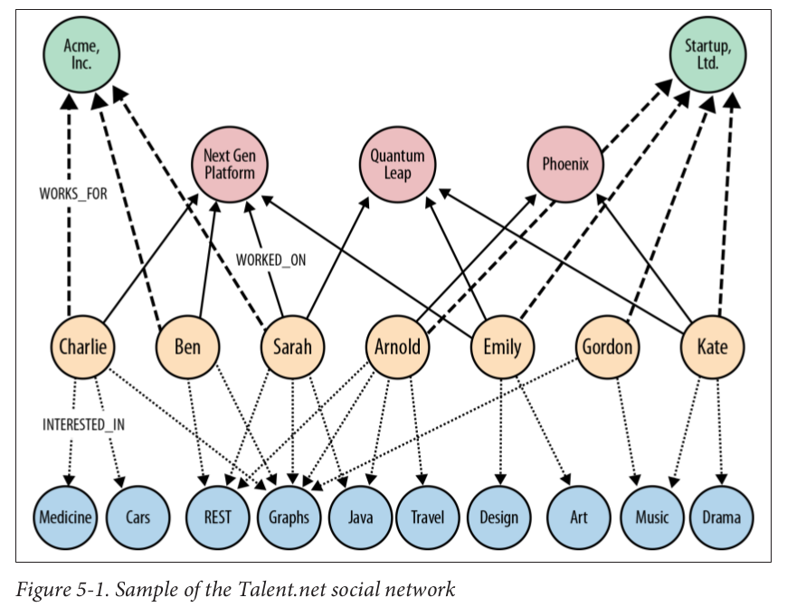 CREATE // User (uc:User {name : 'Charlie'}), (ub:User {name : 'Ben'}), (us:User {name : 'Sarah'}), (ua:User {name : 'Arnold'}), (ue:User {name : 'Emily'}), (ug:User {name : 'Gordon'}), (uk:User {name : 'Kate'}), // Company (ca:Company {name : 'Acme, Inc.'}), (cs:Company {name : 'Startup, Ltd.'}), // Interest (im:Interest {name : 'Medicine'}), (ic:Interest {name : 'Cars'}), (ir:Interest {name : 'REST'}), (ig:Interest {name : 'Graphs'}), (ij:Interest {name : 'Java'}), (it:Interest {name : 'Travel'}), (id:Interest {name : 'Design'}), (ia:Interest {name : 'Art'}), (im1:Interest {name : 'Music'}), (id1:Interest {name : 'Drama'}), // Project (pn:Project {name : 'Next Gen Platform'}), (pq:Project {name : 'Quantum Leap'}), (pp:Project {name : 'Phoenix'}), // WORKS_FOR (uc)-[:WORKS_FOR]->(ca), (ub)-[:WORKS_FOR]->(ca), (us)-[:WORKS_FOR]->(ca), (ua)-[:WORKS_FOR]->(cs), (ue)-[:WORKS_FOR]->(cs), (ug)-[:WORKS_FOR]->(cs), (uk)-[:WORKS_FOR]->(cs), // WORKED_ON (uc)-[:WORKED_ON]->(pn), (ub)-[:WORKED_ON]->(pn), (us)-[:WORKED_ON]->(pn), (us)-[:WORKED_ON]->(pq), (ua)-[:WORKED_ON]->(pp), (ue)-[:WORKED_ON]->(pn), (ue)-[:WORKED_ON]->(pq), (uk)-[:WORKED_ON]->(pq), (uk)-[:WORKED_ON]->(pp), // INTERESTED_IN (uc)-[:INTERESTED_IN]->(im), (uc)-[:INTERESTED_IN]->(ic), (uc)-[:INTERESTED_IN]->(ig), (ub)-[:INTERESTED_IN]->(ir), (ub)-[:INTERESTED_IN]->(ig), (us)-[:INTERESTED_IN]->(ir), (us)-[:INTERESTED_IN]->(ig), (us)-[:INTERESTED_IN]->(ij), (ua)-[:INTERESTED_IN]->(ir), (ua)-[:INTERESTED_IN]->(ig), (ua)-[:INTERESTED_IN]->(ij), (ua)-[:INTERESTED_IN]->(it), (ue)-[:INTERESTED_IN]->(id), (ue)-[:INTERESTED_IN]->(ia), (ug)-[:INTERESTED_IN]->(ig), (ug)-[:INTERESTED_IN]->(im1), (uk)-[:INTERESTED_IN]->(im1), (uk)-[:INTERESTED_IN]->(id1) ; CREATE INDEX ON :User(name); CREATE INDEX ON :Company(name); CREATE INDEX ON :Interest(name); CREATE INDEX ON :Project(name);