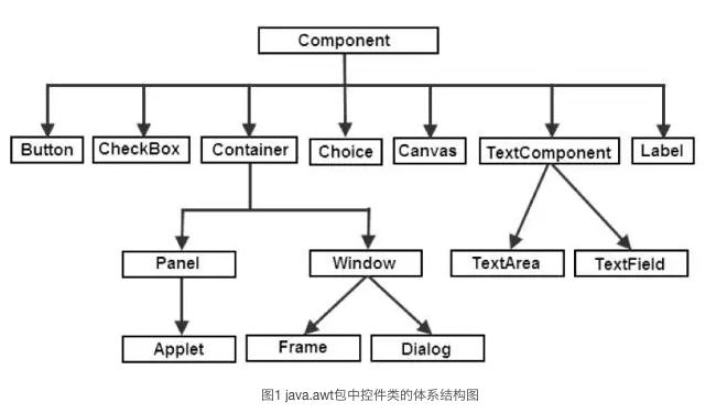如图1所示,为java.awt包中控件类的体系结构图。从图中我们可以看出,控件类的父类为Component,其直接或间接子类中有我们在图形界面中所熟悉控件,如:Frame(窗口)、Button(按钮)、Label(标签)、Checkbox(复选框)、TextArea(多行文本框)、TextField(单行文本框)等等。