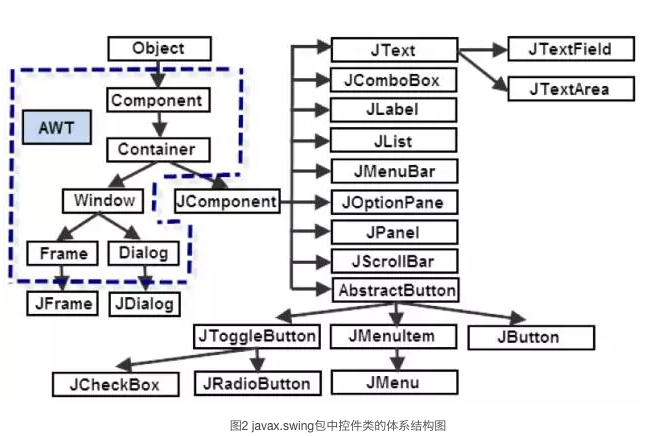 如图2所示,为javax.swing包中控件类的体系结构图。从图中我们可以看出,该包下大部分控件都继承自java.awt包中的控件,如:JFrame的父类为Frame,JComponent的父类为Component等。