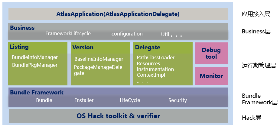 所以Atlas作为一个框架提供了相对完整的能力,业务层的开发可以在框架生命周期的各个环节做一些自定义的动作,也可以自由的调用系统、框架,乃至其它组件释放的能力