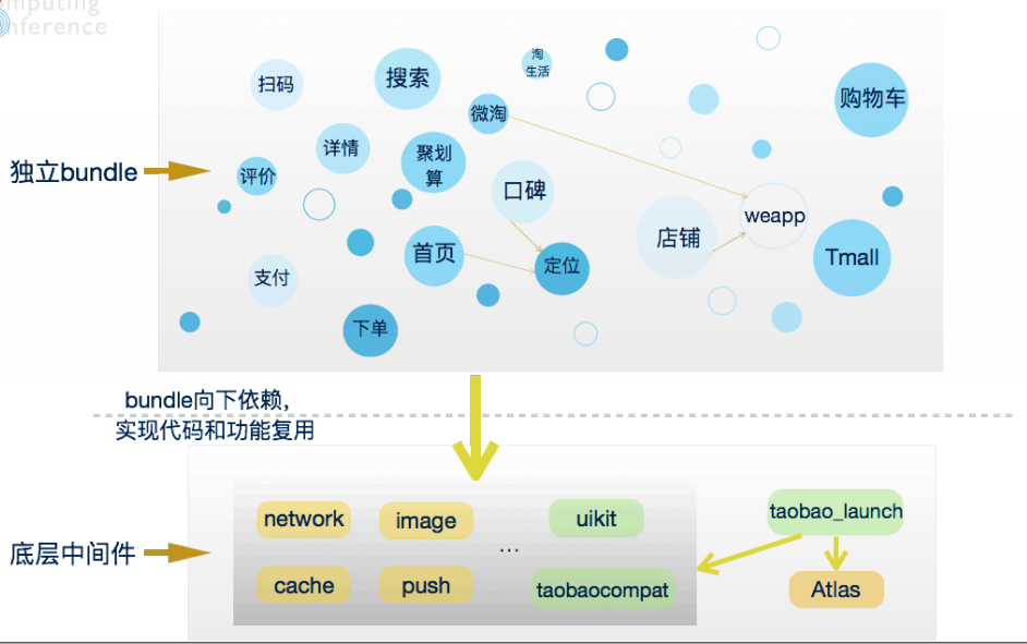 从模块来划分,手淘APK可以分为两层,上层是经过拆分的业务Bundle,扫码、评价、详情,各个业务之间可以进行功能的调用,可以通过路由调度到其他业务方。下层是共享的底层中间件,向业务方开放各种能力,如网络库、图片库等,会在容器里进行统一地把控,这样做的好处是包做到尽可能小,第二是性能佳。