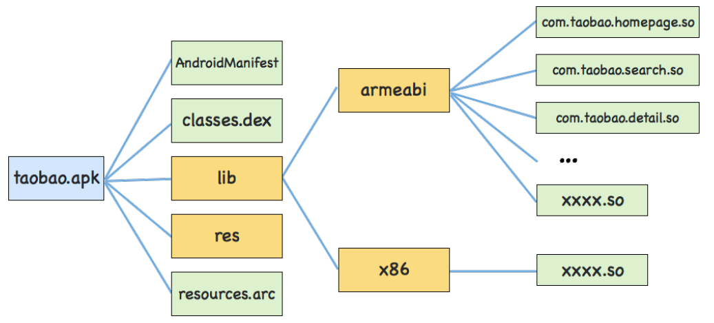 上图是手机淘宝的apk,第一层目录上与标准的apk是完全一样的。在App会有很多的so文件,每个送文件如果解开来看它的结构类似于完整的apk,但本身不能独立运行,它跟很多傻简化的差别是在运行期,它是运行在整个容器里,每一个组件都是独立的Bundle。