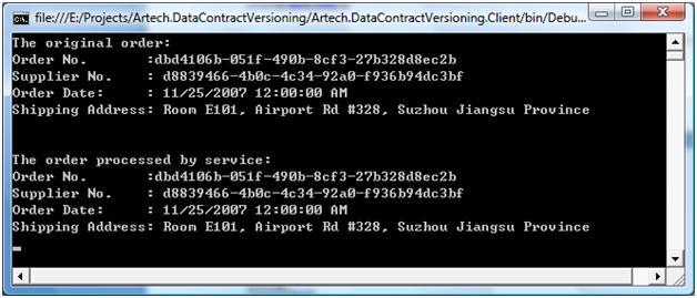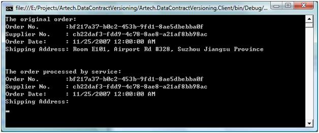 通过上面的结果,我们发现Shipping Address的信息在经过Service处理后丢失了。原因很简单,Service端的Data Contract根本就没有ShippingAddress成员,所有在反序列化生成Order对象的时候将会忽略ShippingAddress的信息。