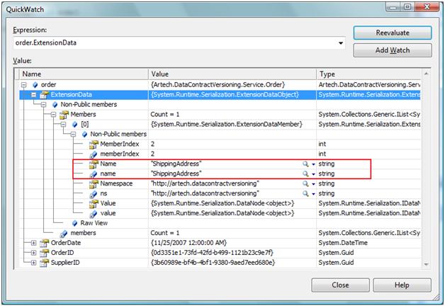 这就是实现了IExtensibleDataObject Interface的效果。就其本质,很简单,对于实现了该Interface的Data contract,将通过一个ExtensionDataObject 类型的对象来保存和获取那些没有在Data Contract定义的成员。为了一窥Order的ExtensionData属性中保存的内容,我们在Service进行Debug,在QuickWatch中看看它是不是真的保存了不能识别的ShippingAddress: