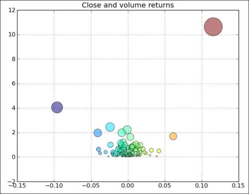 ax.scatter(ret, volchange, c=ret * 100, s=volchange * 100, alpha=0.5)