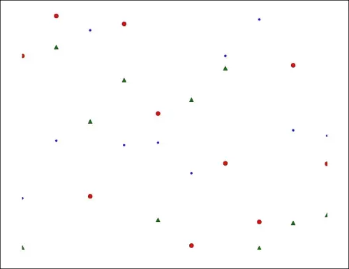 circles, triangles, dots = ax.plot(x, 'ro', y, 'g^', z, 'b.')