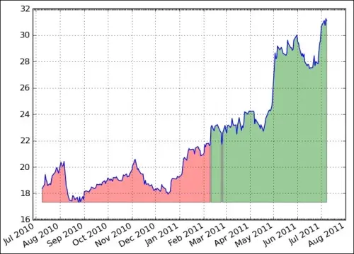 plt.fill_between(dates, close.min(), close, where=close>close.mean(), facecolor="green", alpha=0.4)