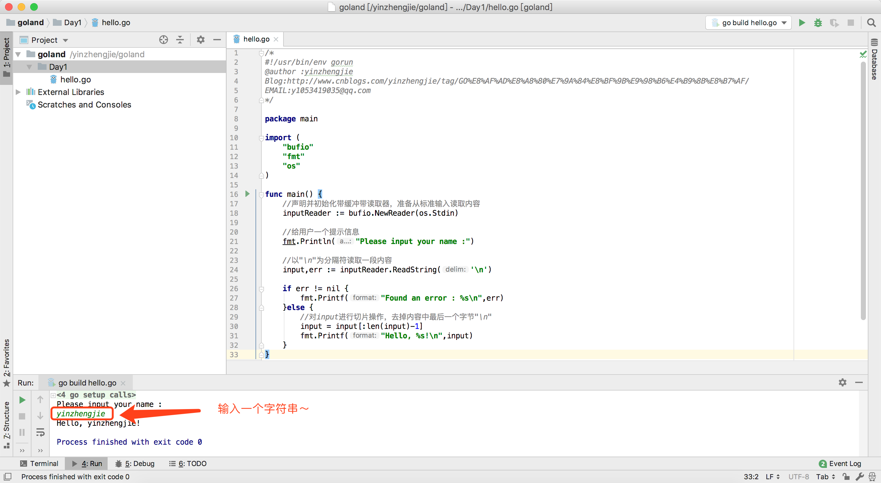 /* #!/usr/bin/env gorun @author :yinzhengjie Blog:http://www.cnblogs.com/yinzhengjie/tag/GO%E8%AF%AD%E8%A8%80%E7%9A%84%E8%BF%9B%E9%98%B6%E4%B9%8B%E8%B7%AF/ EMAIL:y1053419035@qq.com */ package main import ( "bufio" "fmt" "os" ) func main() { //声明并初始化带缓冲带读取器,准备从标准输入读取内容 inputReader := bufio.NewReader(os.Stdin) //给用户一个提示信息 fmt.Println("Please input your name :") //以"\n"为分隔符读取一段内容 input,err := inputReader.ReadString('\n') if err != nil { fmt.Printf("Found an error : %s\n",err) }else { //对input进行切片操作,去掉内容中最后一个字节"\n" input = input[:len(input)-1] fmt.Printf("Hello, %s!\n",input) } }