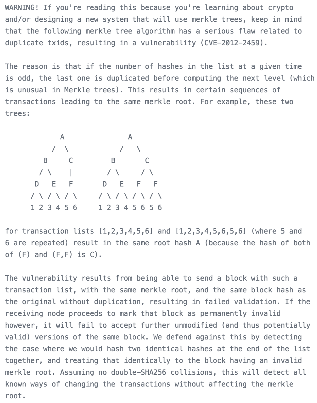 比特币和以太坊都使用了默克尔树这种数据结构,只不过里面存放的数据都是哈希。我们在比特币的核心版本源码中可以发现注释中有介绍。