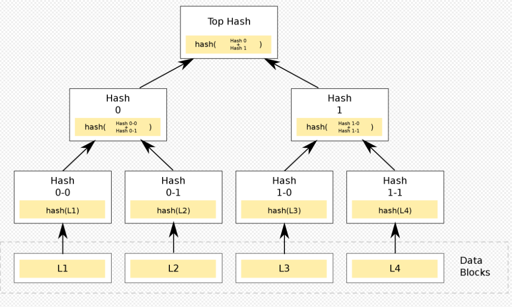 哈希算法的一个重要应用是默克尔树(Merkle tree),默克尔树是一种数据结构,通常是一个二叉树,也有可能是多叉树,它以特定的方式逐层向上计算,直到顶部,最顶层叫做默克尔根,默克尔树最为常见和最简单的是二叉默克尔树。