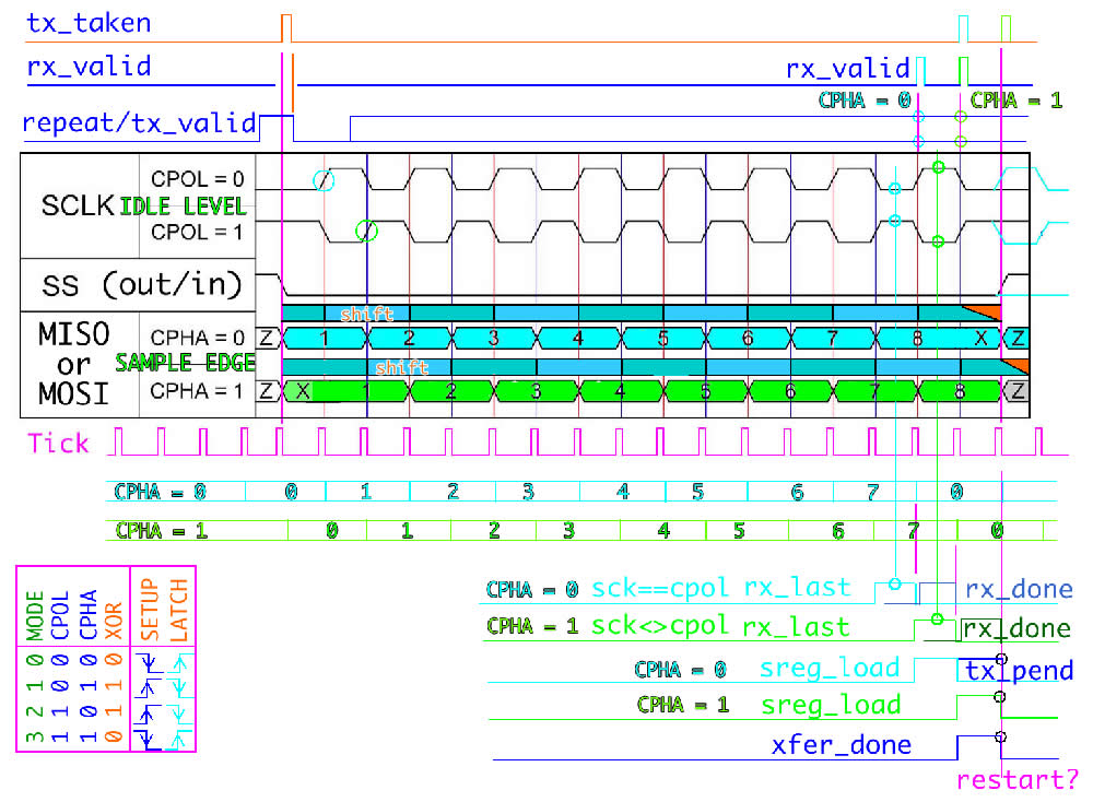 1 ---------------------------------------------------------------------------------- 2 -- Company: 3 -- Engineer: shangdawei@gmail.com 4 -- 5 -- Create Date: 08:46:25 05/12/2012 6 -- Design Name: 7 -- Module Name: spi_master - Behavioral 8 -- Project Name: 9 -- Target Devices: 10 -- Tool versions: 11 -- Description: 12 -- 13 -- Dependencies: 14 -- 15 -- Revision: 16 -- Revision 0.01 - File Created 17 -- Additional Comments: 18 -- 19 ---------------------------------------------------------------------------------- 20 21 library IEEE; 22 use IEEE.std_logic_1164.all; 23 24 -- Uncomment the following library declaration if using 25 -- arithmetic functions with Signed or Unsigned values 26 use IEEE.NUMERIC_STD.all; 27 28 -- Uncomment the following library declaration if instantiating 29 -- any Xilinx primitives in this code. 30 -- library UNISIM; 31 -- use UNISIM.VComponents.all; 32 33 entity spi_master is 34 generic ( 35 C_MODE : natural := 0; -- dymatic change enabled when C_MODE > 3 36 C_WIDTH : natural := 9 ); 37 port ( 38 i_clock : in std_logic; -- system clock 39 i_tick : in std_logic; -- xfer enable 40 i_cpol : in std_logic; -- spi clock polarity 41 i_cpha : in std_logic; -- spi clock phase 42 o_sck : out std_logic; -- spi clock 43 o_ss_n : out std_logic; -- spi ss_n ( Ready/nBusy ) 44 o_mosi : out std_logic; -- master out, slave in 45 i_miso : in std_logic; -- master in, slave out 46 i_repeat : in std_logic; -- repeat receive 47 i_tx_valid : in std_logic; -- initiate transaction 48 o_tx_taken : out std_logic; -- tx data taken 49 o_rx_valid : out std_logic; -- rx data valid 50 i_tx_msb : in std_logic_vector (4 downto 0); -- msb of transmit word 51 o_rx_data : out std_logic_vector (C_WIDTH-1 downto 0); -- ( to fifo or rdr ) 52 i_tx_data : in std_logic_vector (C_WIDTH-1 downto 0)); -- ( from fifo or tdr ) 53 end spi_master; 54 55 architecture Behavioral of spi_master is 56 57 signal cpha : std_logic; 58 signal cpol : std_logic; 59 signal cpol_cpha : unsigned (1 downto 0); 60 signal rx_sample : std_logic; 61 signal tx_taken : std_logic := '0'; 62 signal tx_pending : std_logic := '0'; 63 signal rx_last : std_logic; 64 signal rx_done : std_logic := '0'; 65 signal xfer_done : std_logic := '0'; 66 signal rx_valid : std_logic := '0'; 67 signal miso : std_logic; 68 signal sck : std_logic := '0'; 69 signal mosi : std_logic := '0'; 70 signal ss_n : std_logic := '1'; 71 signal rx_cntr : unsigned( 5 downto 0 ) := ( others => '0' ); -- max 32 bits 72 signal shift_reg : std_logic_vector (C_WIDTH-1 downto 0) := ( others => '0' ); 73 signal sreg_load : std_logic; 74 75 begin 76 o_sck <= sck; 77 o_mosi <= mosi; 78 o_ss_n <= ss_n; 79 o_tx_taken <= tx_taken; 80 o_rx_valid <= rx_valid; 81 o_rx_data <= shift_reg; 82 83 cpol_cpha <= to_unsigned( C_MODE, 2 ); 84 cpha <= i_cpha when C_MODE > 3 else cpol_cpha(0); 85 cpol <= i_cpol when C_MODE > 3 else cpol_cpha(1); 86 87 rx_sample <= ( not ( sck xor cpha xor cpol ) ) and ( not ss_n ); -- diff with cpha/cpol 88 rx_last <= '1' when ( rx_cntr = unsigned(i_tx_msb) ) and ( sck = ( cpha xor cpol) ) else '0'; 89 rx_done <= rx_last when rising_edge( i_clock ) and (i_tick = '1' ); -- for both cpha 90 sreg_load <= ( i_tx_valid and ss_n ) or ( i_tx_valid and rx_done ); -- idle or running 91 92 -- xfer done : whether restart next xfer, or go idle 93 process begin 94 wait until rising_edge( i_clock ); 95 if (i_tick = '1' ) then 96 if ( cpha = '0' ) then 97 xfer_done <= rx_done; 98 else -- ( cpha = '1' ) 99 xfer_done <= rx_last; 100 end if; 101 end if; 102 end process; 103 104 process begin 105 wait until rising_edge( i_clock ); 106 if rx_last = '1' then -- rx_last : 1 spi clock cycle 107 rx_valid <= i_tick; -- rx_valid : 1 clock cycle 108 else 109 rx_valid <= '0'; 110 end if; 111 end process; 112 113 -- host can write next data to xfer 114 process begin 115 wait until rising_edge( i_clock ); 116 if ss_n = '1' then -- first xfer only, always tx_taken 117 tx_taken <= i_tick and sreg_load; 118 else -- last xfer no tx_taken ( sreg_load = '0' ) 119 tx_taken <= i_tick and rx_done and sreg_load; 120 end if; -- other xfer give ack 121 end process; 122 123 -- Counting SPI word length : rx_bit # 124 process begin 125 wait until rising_edge( i_clock ); 126 if (i_tick = '1' ) then 127 if ( ss_n = '1' ) or ( rx_last = '1' ) then 128 rx_cntr <= ( others => '0' ); 129 elsif (sck = ( cpha xor cpol ) ) then 130 rx_cntr <= rx_cntr + 1; 131 end if; 132 end if; 133 end process; 134 135 process begin 136 wait until rising_edge( i_clock ); 137 if (i_tick = '1' ) then 138 if cpha = '0' then 139 if ( rx_done = '1' ) then 140 tx_pending <= sreg_load; 141 elsif ( xfer_done = '1' ) then 142 tx_pending <= '0'; 143 end if; 144 end if; 145 end if; 146 end process; 147 148 149 -- Writing the ss_n 150 -- xfer done : whether restart next xfer, or go idle 151 process begin 152 wait until rising_edge( i_clock ); 153 if (i_tick = '1' ) then 154 if ( i_tx_valid = '1' ) then -- xfer_done -> tx_taken -> i_tx_valid 155 ss_n <= '0'; -- i_tx_valid until xfer_done for cpha = '1' 156 157 elsif ( xfer_done = '1' ) then -- cpha = '0' 158 ss_n <= (not i_repeat) and ( not tx_pending ) ; 159 end if; 160 end if; 161 end process; 162 163 -- Generating the SPI clock 164 -- xfer done : whether restart next xfer, or go idle 165 process begin 166 wait until rising_edge( i_clock ); 167 if (i_tick = '1' ) then 168 if ( xfer_done = '1' ) then --- cpha = '1' --- --- cpha = '0' --- 169 if ( i_repeat = '1' ) or ( sreg_load = '1' ) or ( tx_pending = '1' ) then 170 sck <= not sck; 171 else 172 sck <= cpol; -- idle 173 end if; 174 elsif ( ss_n = '0' ) then 175 sck <= not sck; 176 else 177 sck <= cpol; -- idle 178 end if; 179 end if; 180 end process; 181 182 -- Writing the mosi from init data or shifted data 183 process begin 184 wait until rising_edge( i_clock ); 185 if (i_tick = '1' ) then 186 if sreg_load = '1' then 187 -- mosi <= i_tx_data( to_integer( unsigned(i_tx_msb) ) ); 188 mosi <= shift_reg( to_integer( unsigned(i_tx_msb) ) )