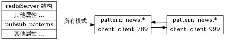 举个例子,假设在一个 redisServer 实例中,有一个叫做 news.* 的模式同时被客户端client_789 和 client_999 订阅,那么这个 redisServer 结构看起来应该是这样子: