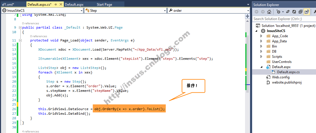 下面是读xml文档,加载入List<T>集合中,然后使用OrderBy来进行排序。